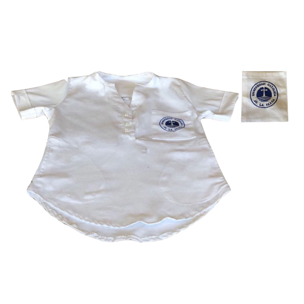 Tela Spandex ( 97% Algodón, 3% elastano). Chaqueta de Spandex, cuello redondo con tres/cuatro botones, con dos bolsillos laterales y uno superior delantero aplicado. Espalda con tiras ajustables.
