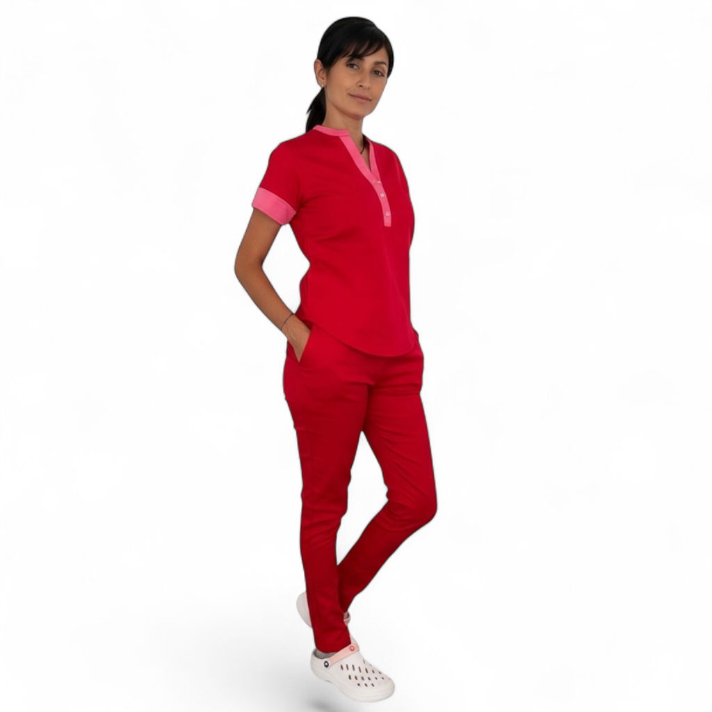 Tela Spandex ( 97% Algodón, 3% elastano). Chaqueta de Spandex, cuello redondo con tres/cuatro botones, con dos bolsillos laterales y uno superior delantero. Espalda con tiras ajustables. Pantalón de Spandex, Chupin, con elástico en cintura trasera y bolsillos laterales.