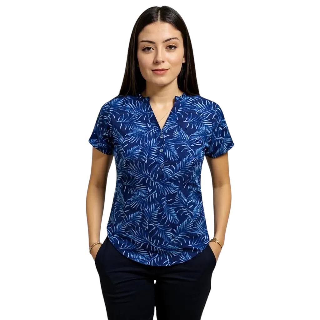 Tela Spandex ( 97% Algodón, 3% elastano). Chaqueta de Spandex, cuello redondo con tres/cuatro botones, con dos bolsillos laterales y uno superior delantero. Espalda con tiras ajustables.