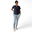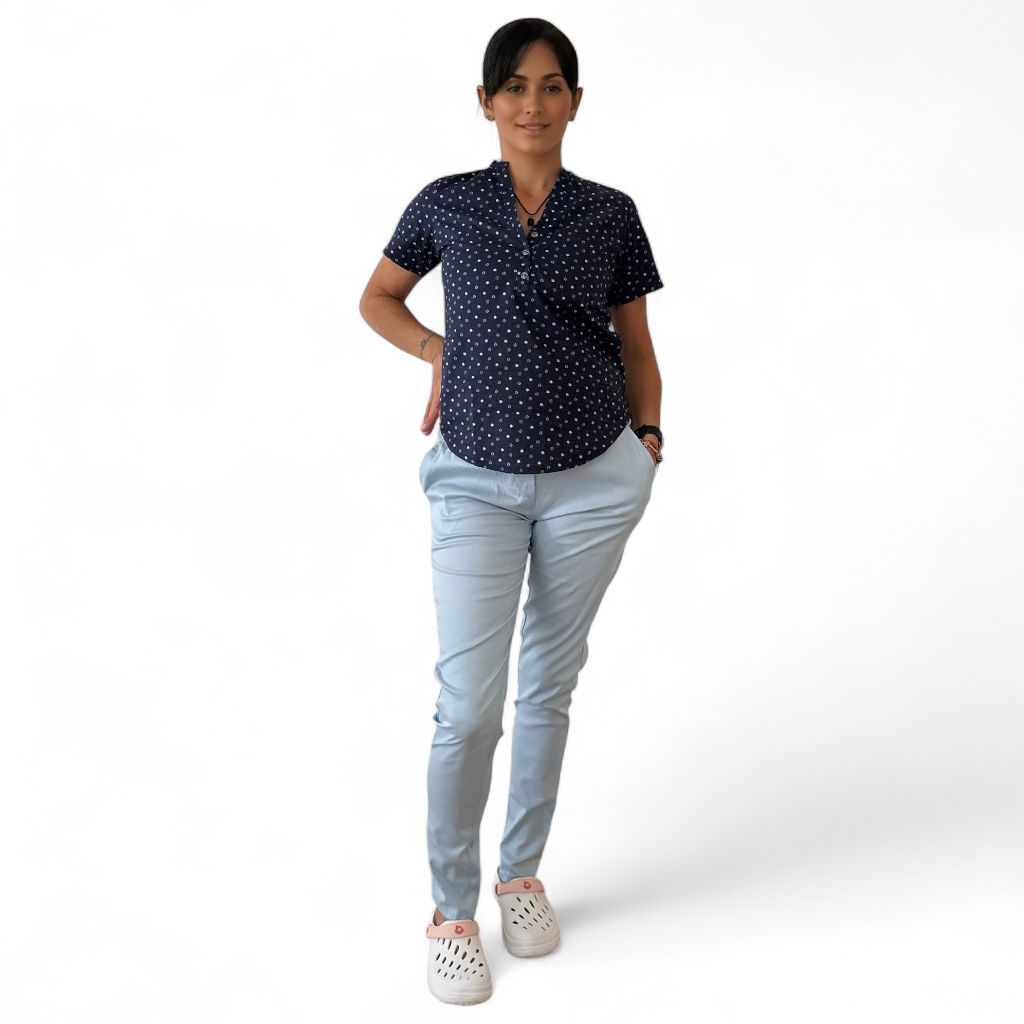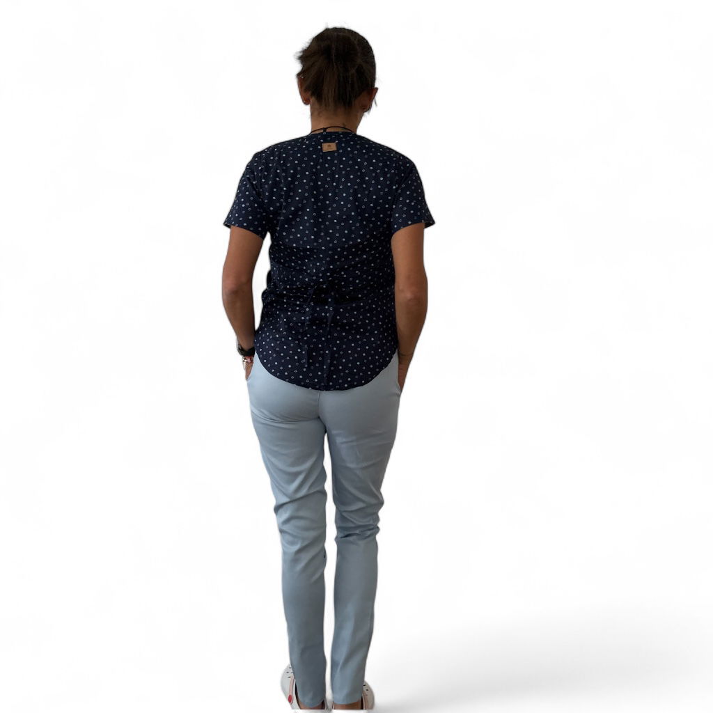 Tela Spandex ( 97% Algodón, 3% elastano). Chaqueta de Spandex, cuello redondo con tres/cuatro botones, con dos bolsillos laterales y uno superior delantero. Espalda con tiras ajustables. Pantalón de Spandex, Chupin, con elástico en cintura trasera y bolsillos laterales.