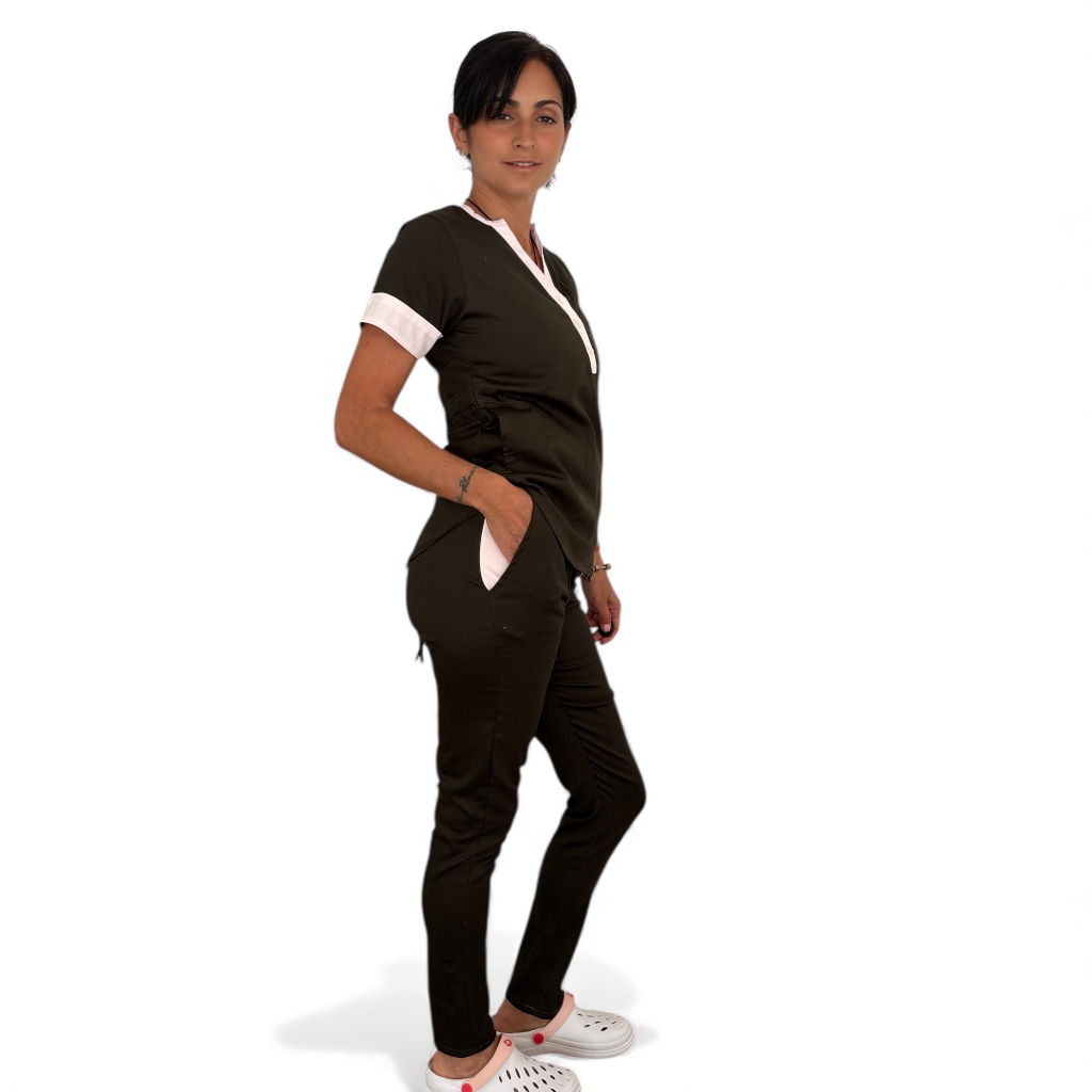 Tela Spandex ( 97% Algodón, 3% elastano). Chaqueta de Spandex, cuello redondo con tres/cuatro botones, con dos bolsillos laterales y uno superior delantero. Espalda con tiras ajustables. Pantalón de Spandex, Chupin, con elástico en cintura trasera y bolsillos laterales.