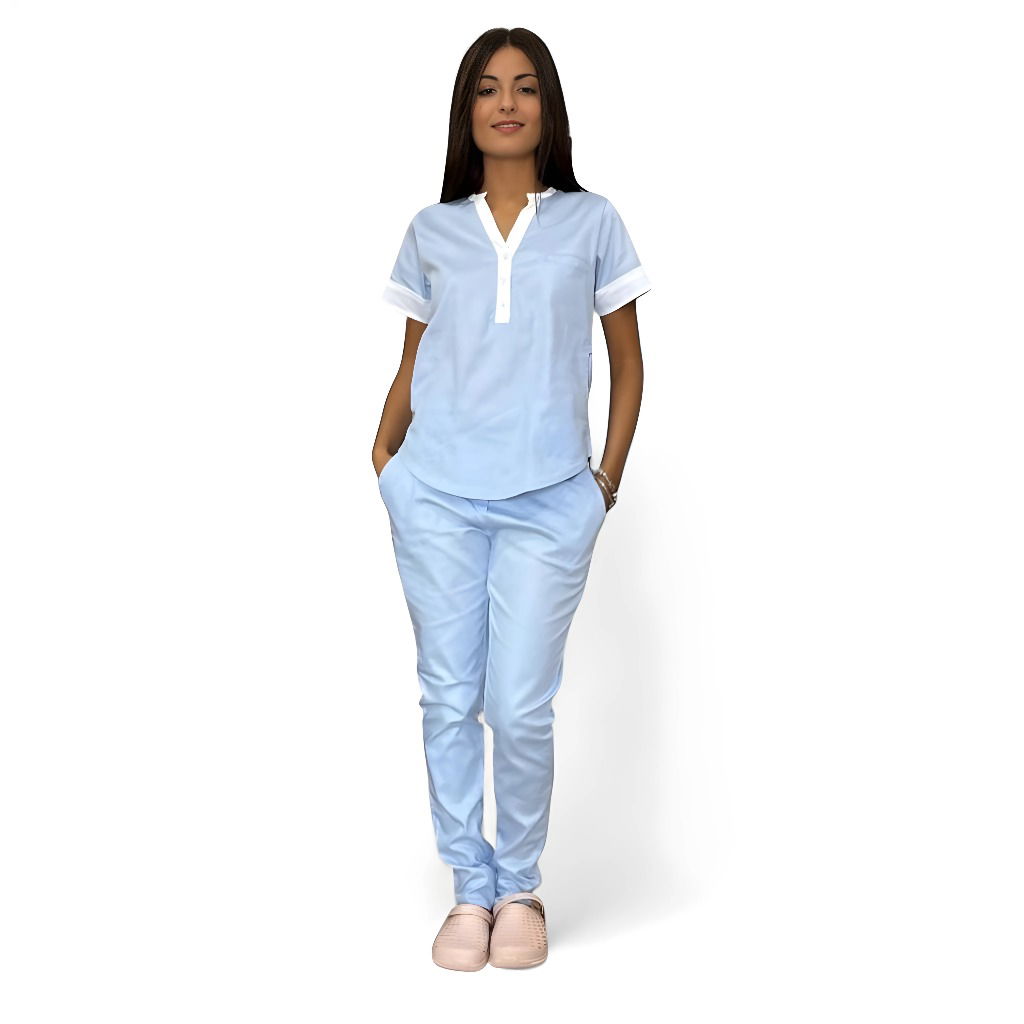 Tela Spandex ( 97% Algodón, 3% elastano). Chaqueta de Spandex, cuello redondo con tres/cuatro botones, con dos bolsillos laterales y uno superior delantero. Espalda con tiras ajustables.