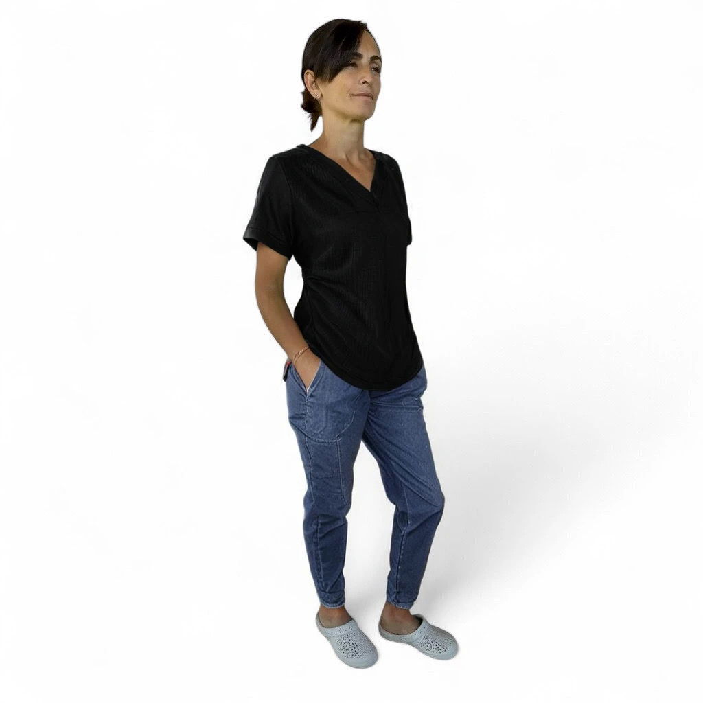 Lino con spandex (Rayón 98% 2 % spandex ) - Chaqueta de Lino,, cuello escote en V, con 2 bolsillos laterales y un Bolsillo de frente aplicado. Espalda con tiras ajustables.