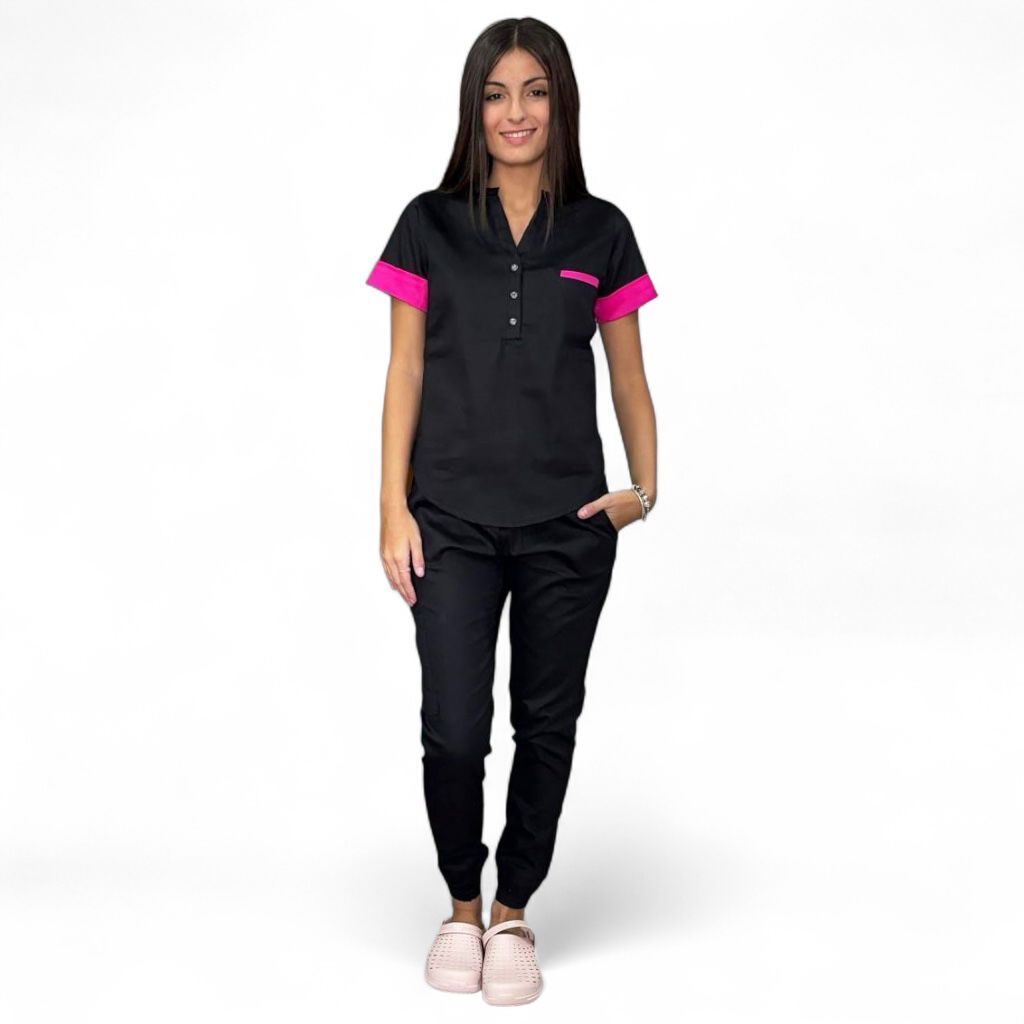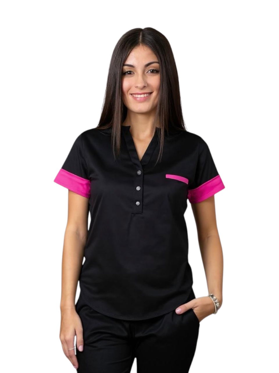 Chaqueta de Spandex, ,  cuello redondo con tres/cuatro botones, con dos bolsillos laterales y uno superior delantero aplicado. Espalda con tiras ajustables.