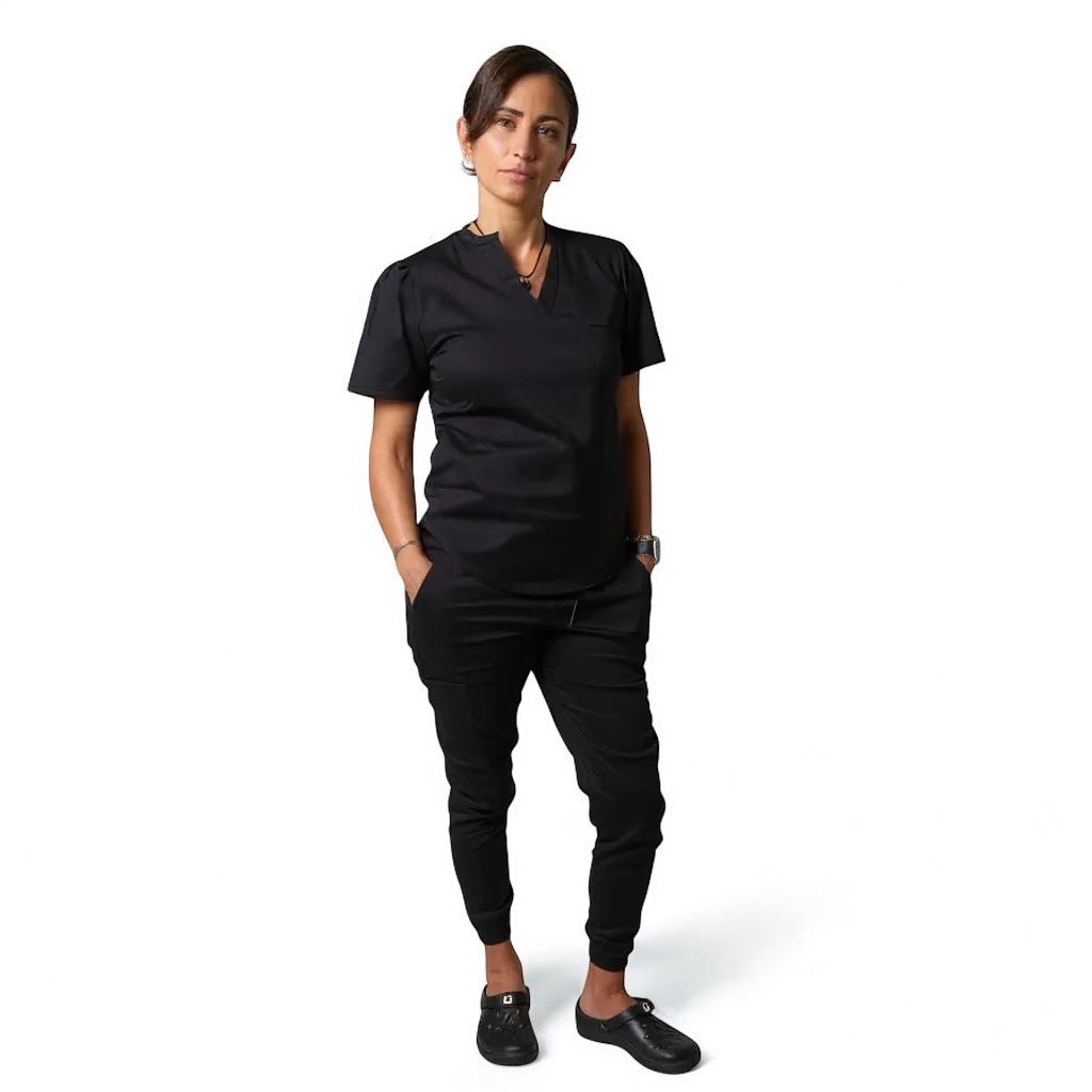 Chaqueta de Spandex, o,  cuello en V , mangas princesa , con dos bolsillos laterales y uno superior delantero aplicado. Espalda con tiras ajustables.