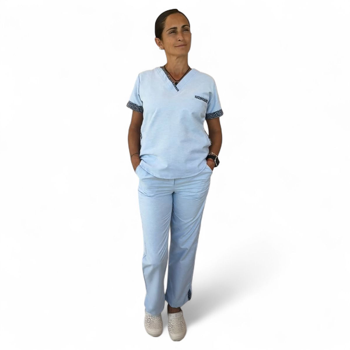Chaqueta de Tela Oxford , cuello escote en V, con 2 bolsillos laterales y un Bolsillo de frente aplicado. Espalda con tiras ajustables.
