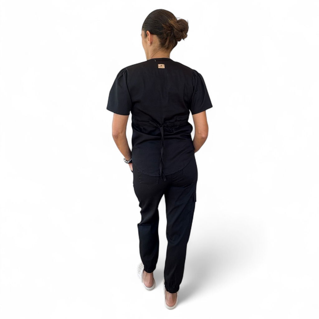 Chaqueta de Spandex, o, cuello en V , mangas princesa , con dos bolsillos laterales y uno superior delantero aplicado. Espalda con tiras ajustables.