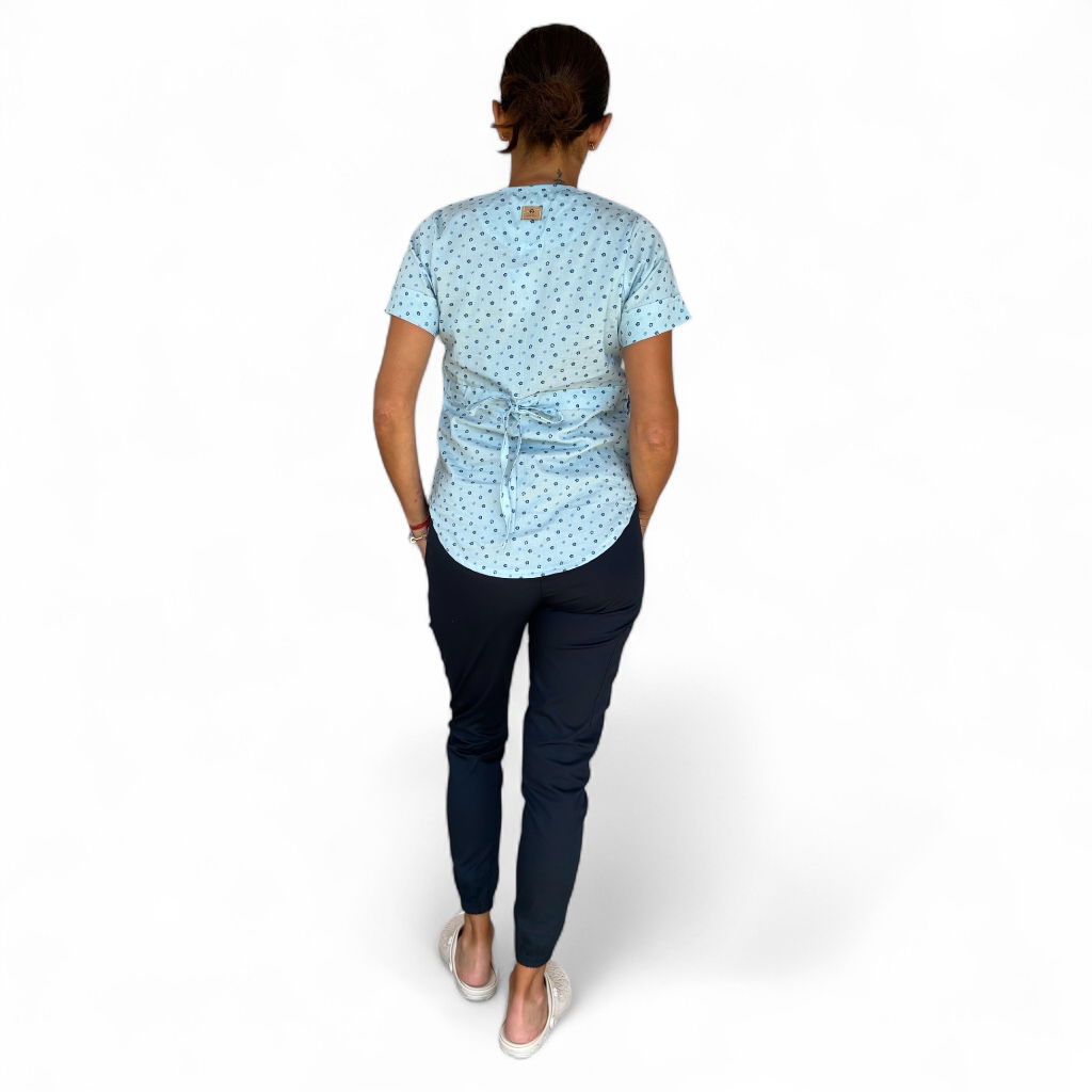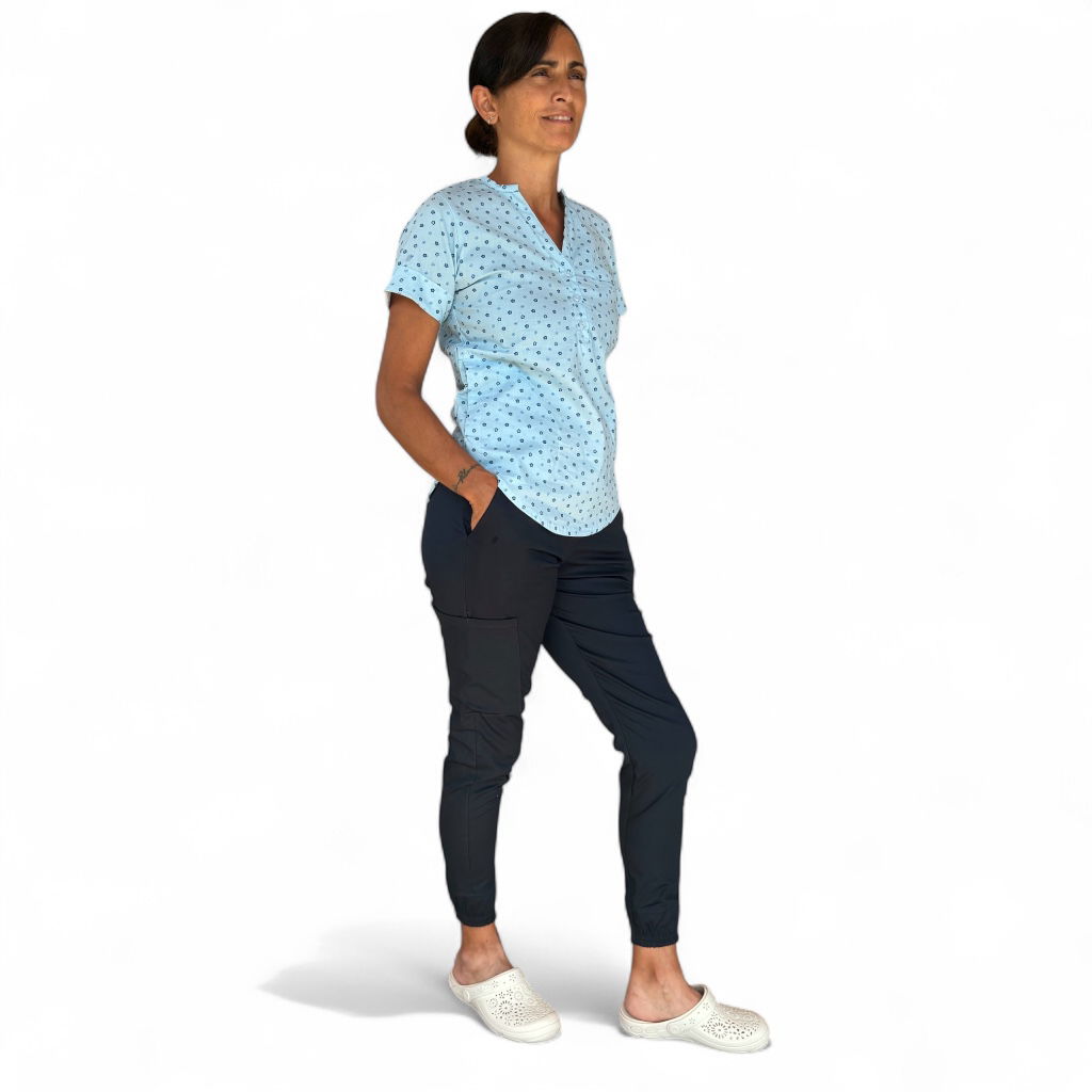 Tela Spandex ( 97% Algodón, 3% elastano). Chaqueta de Spandex, cuello redondo con tres/cuatro botones, con dos bolsillos laterales y uno superior delantero. Espalda con tiras ajustables. Pantalón de Spandex, Chupin, con elástico en cintura trasera y bolsillos laterales.