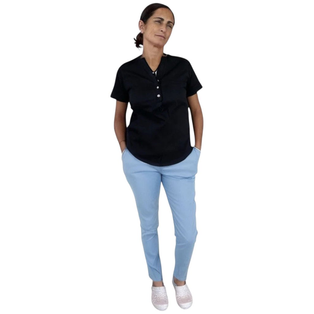 Tela Spandex ( 97% Algodón, 3% elastano). Chaqueta de Spandex, cuello redondo con tres/cuatro botones, con dos bolsillos laterales y uno superior delantero. Espalda con tiras ajustables.