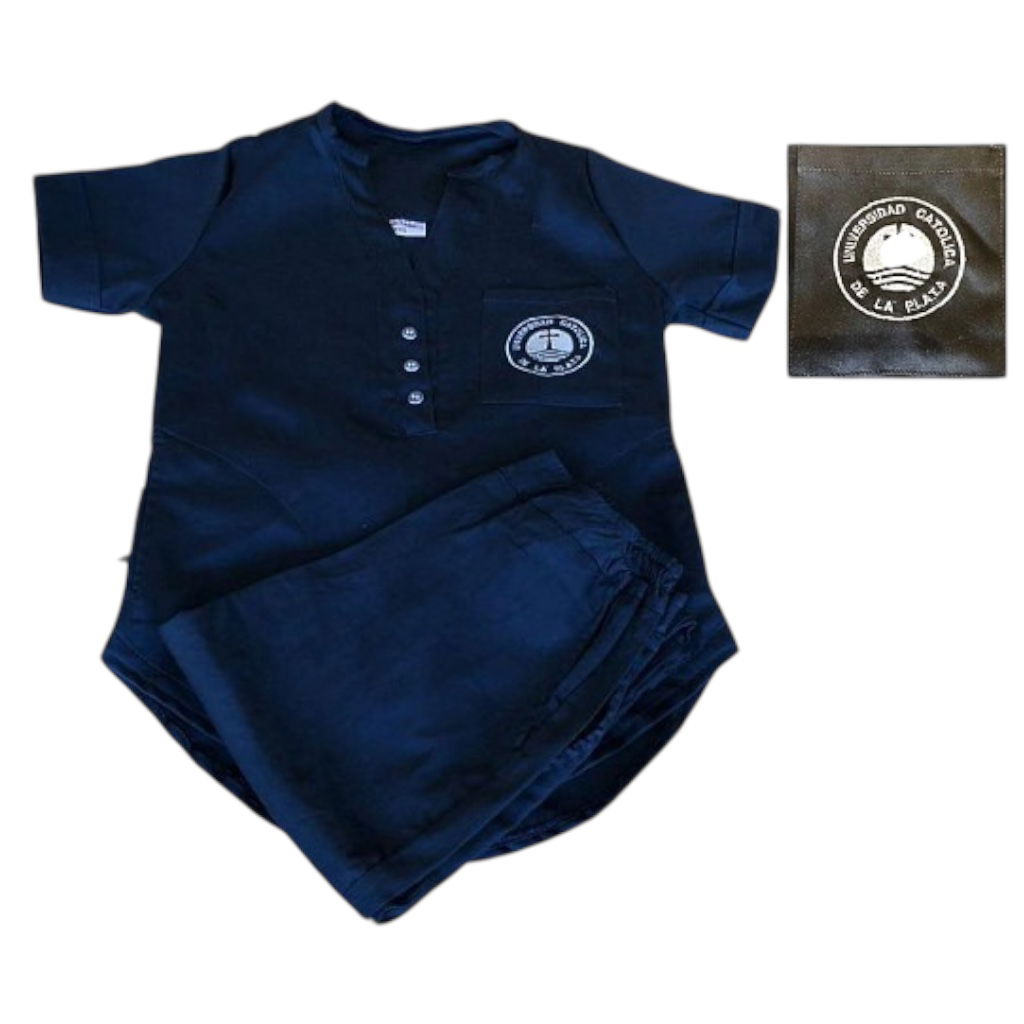 Tela Spandex ( 97% Algodón, 3% elastano). Chaqueta de Spandex, cuello redondo con tres/cuatro botones, con dos bolsillos laterales y uno superior delantero. Espalda con tiras ajustables. Pantalón de Spandex, Chupin, con elástico en cintura trasera y bolsillos laterales.