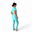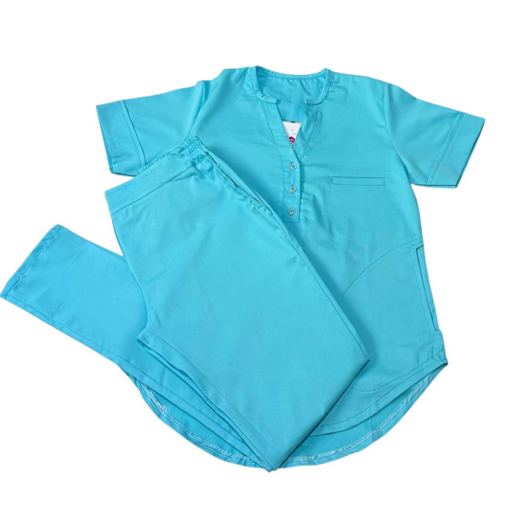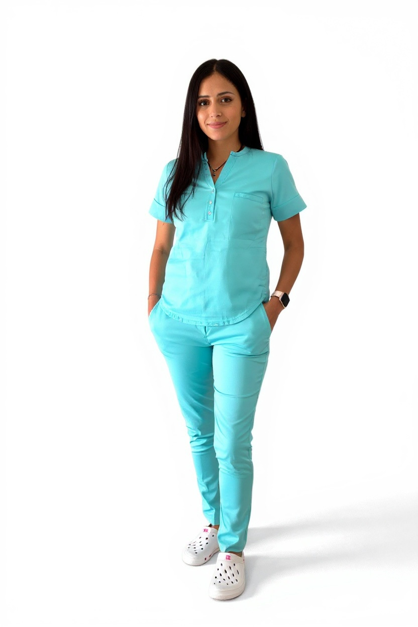 Tela Spandex ( 97% Algodón, 3% elastano). Chaqueta de Spandex, cuello redondo con tres/cuatro botones, con dos bolsillos laterales y uno superior delantero. Espalda con tiras ajustables. Pantalón de Spandex, Chupin, con elástico en cintura trasera y bolsillos laterales.
