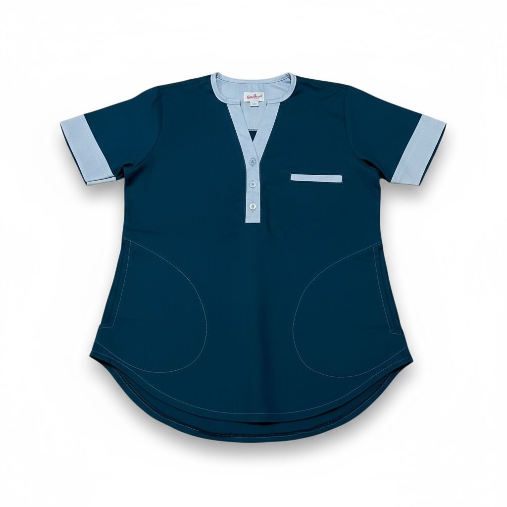 Tela Spandex ( 97% Algodón, 3% elastano). Chaqueta de Spandex, cuello redondo con tres/cuatro botones, con dos bolsillos laterales y uno superior delantero. Espalda con tiras ajustables.
