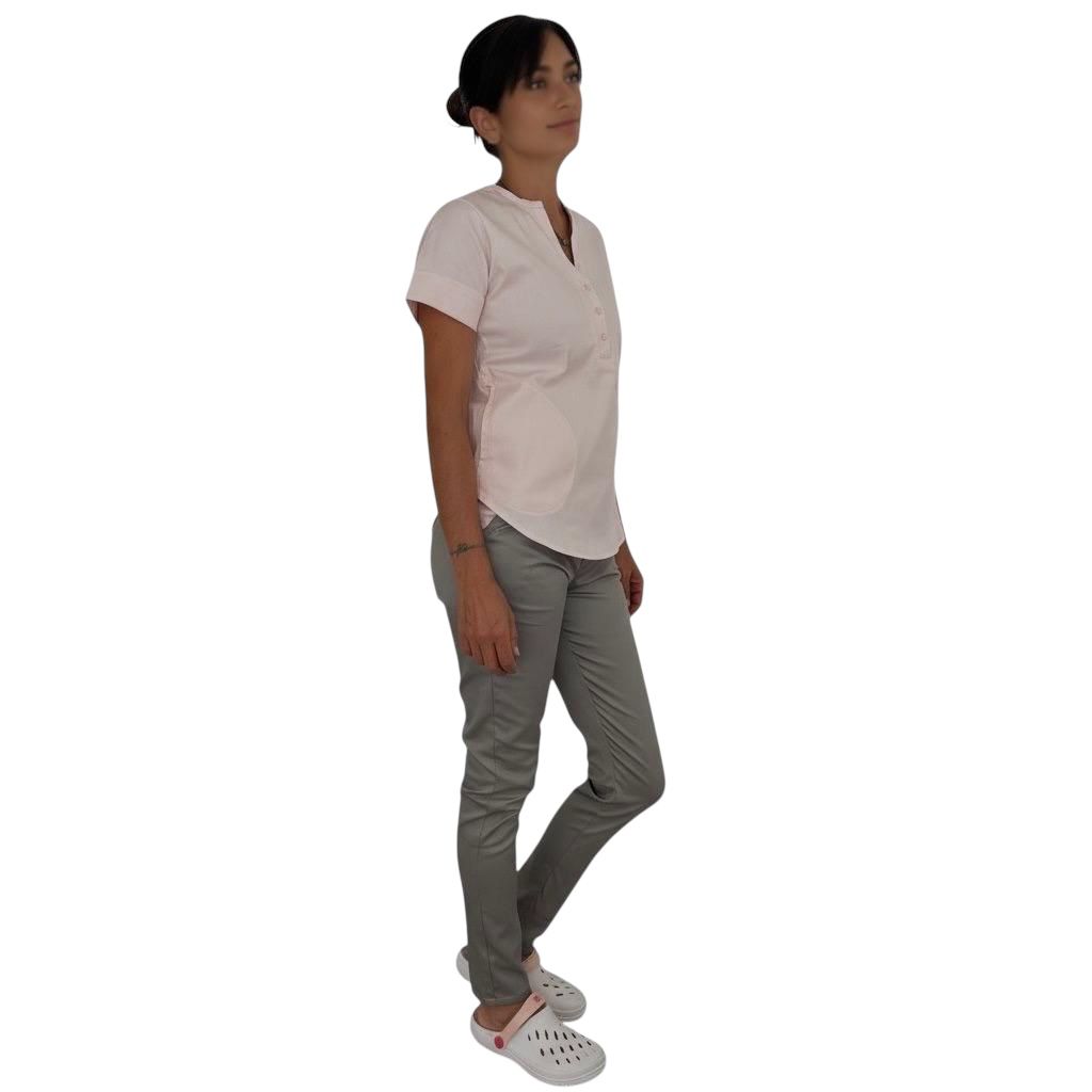 Tela Spandex ( 97% Algodón, 3% elastano). Chaqueta de Spandex, cuello redondo con tres/cuatro botones, con dos bolsillos laterales y uno superior delantero. Espalda con tiras ajustables. Pantalón de Spandex, Chupin, con elástico en cintura trasera y bolsillos laterales.