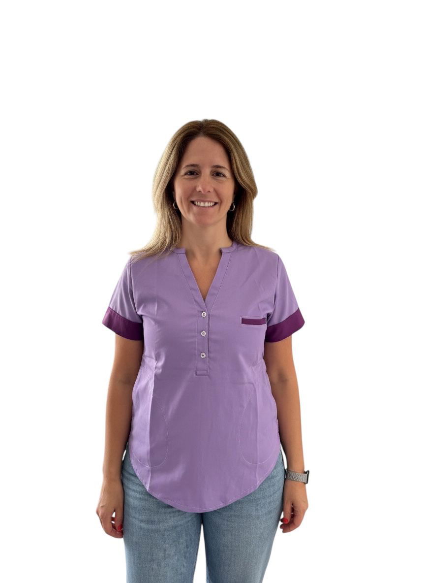 Tela Spandex ( 97% Algodón, 3% elastano). Chaqueta de Spandex, cuello redondo con tres/cuatro botones, con dos bolsillos laterales y uno superior delantero. Espalda con tiras ajustables.