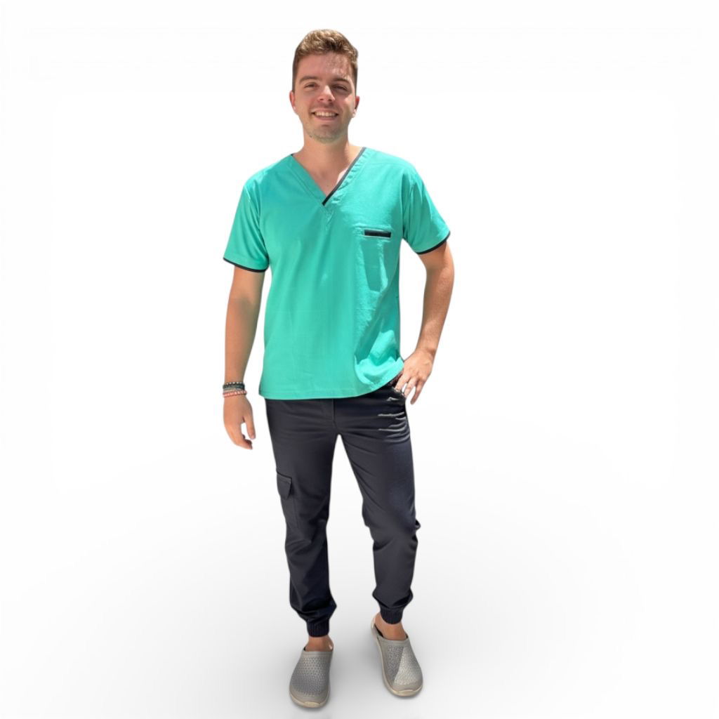 Chaqueta tela spandex escote en V, con 3 bolsillos, (2 bolsillos laterales y 1 ojal).