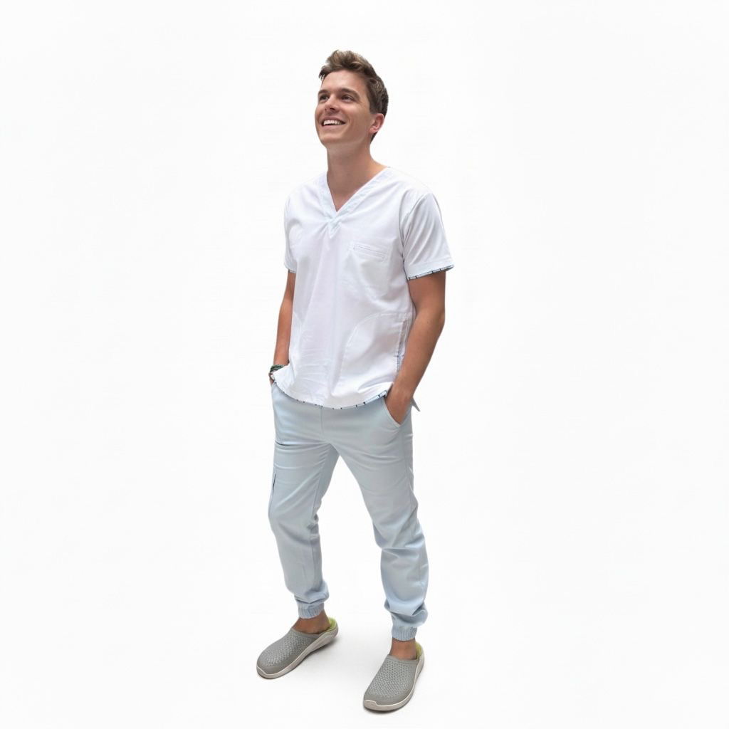 Chaqueta tela spandex escote en V, con 3 bolsillos, (2 bolsillos laterales y 1 ojal).