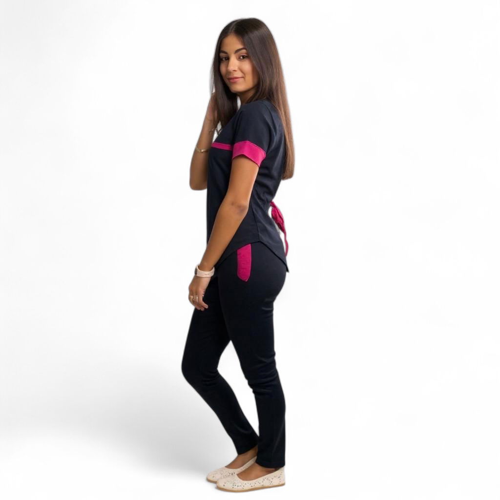 Tela Spandex ( 97% Algodón, 3% elastano). Chaqueta de Spandex, cuello redondo con tres/cuatro botones, con dos bolsillos laterales y uno superior delantero. Espalda con tiras ajustables. Pantalón de Spandex, Chupin, con elástico en cintura trasera y bolsillos laterales.
