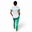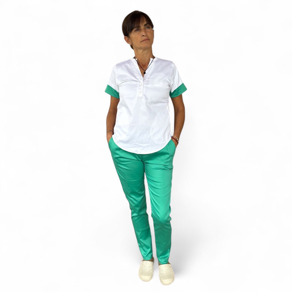 Tela Spandex ( 97% Algodón, 3% elastano). Chaqueta de Spandex, cuello redondo con tres/cuatro botones, con dos bolsillos laterales y uno superior delantero. Espalda con tiras ajustables. Pantalón de Spandex, Chupin, con elástico en cintura trasera y bolsillos laterales.