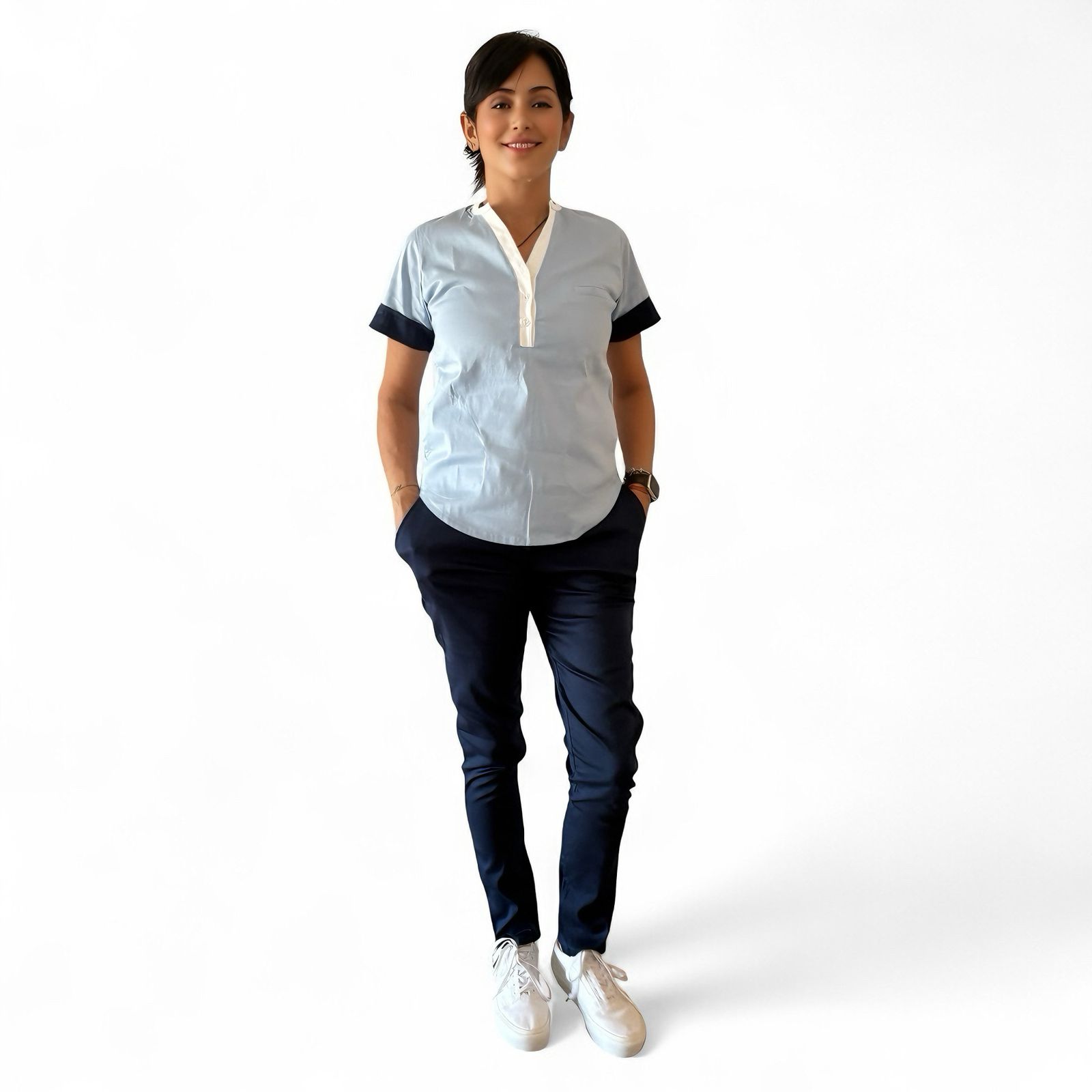 Tela Spandex ( 97% Algodón, 3% elastano). Chaqueta de Spandex, cuello redondo con tres/cuatro botones, con dos bolsillos laterales y uno superior delantero. Espalda con tiras ajustables. Pantalón de Spandex, Chupin, con elástico en cintura trasera y bolsillos laterales.