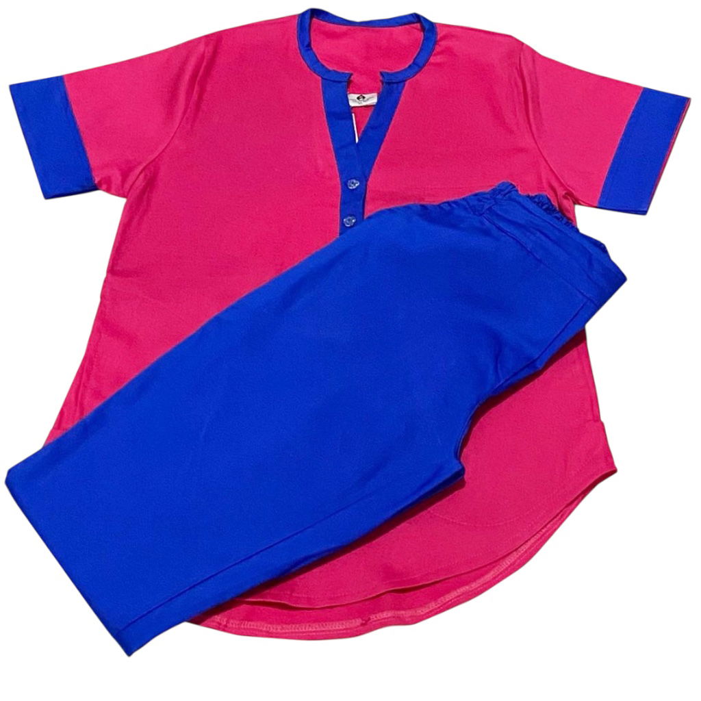 Tela Spandex ( 97% Algodón, 3% elastano). Chaqueta de Spandex, cuello redondo con tres/cuatro botones, con dos bolsillos laterales y uno superior delantero. Espalda con tiras ajustables. Pantalón de Spandex, Chupin, con elástico en cintura trasera y bolsillos laterales.