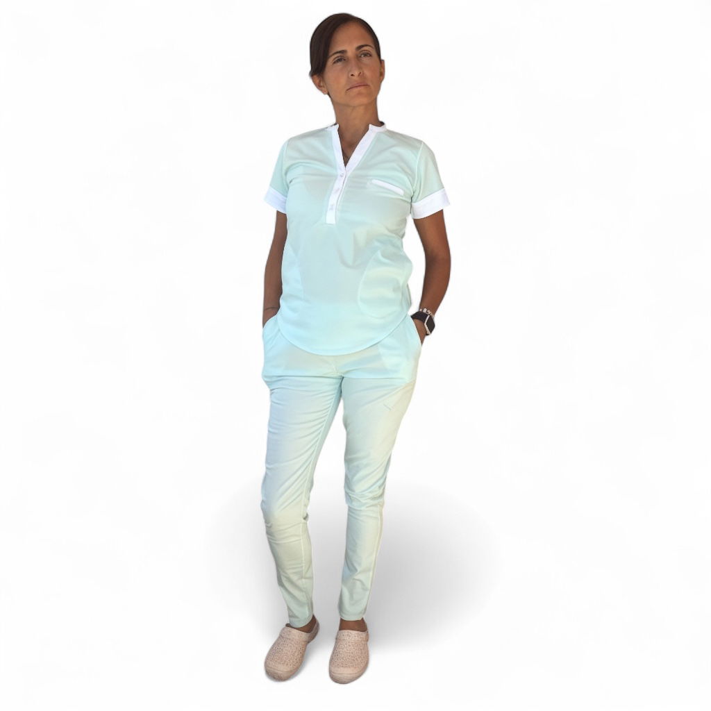 Tela Spandex ( 97% Algodón, 3% elastano). Chaqueta de Spandex, cuello redondo con tres/cuatro botones, con dos bolsillos laterales y uno superior delantero. Espalda con tiras ajustables. Pantalón de Spandex, Chupin, con elástico en cintura trasera y bolsillos laterales.