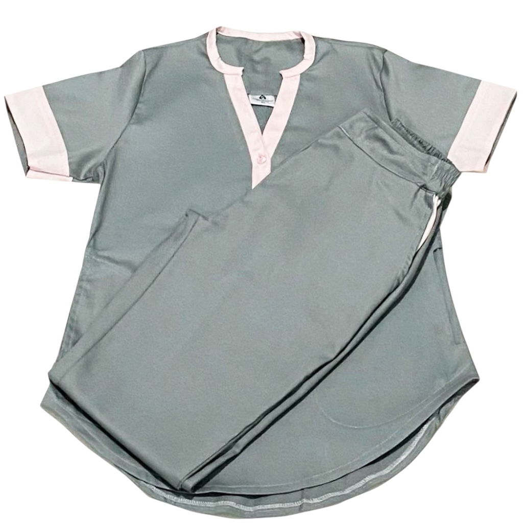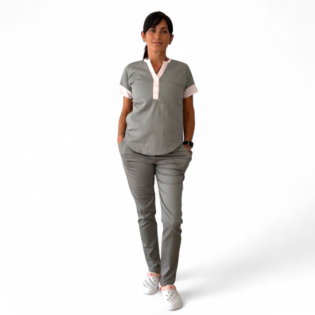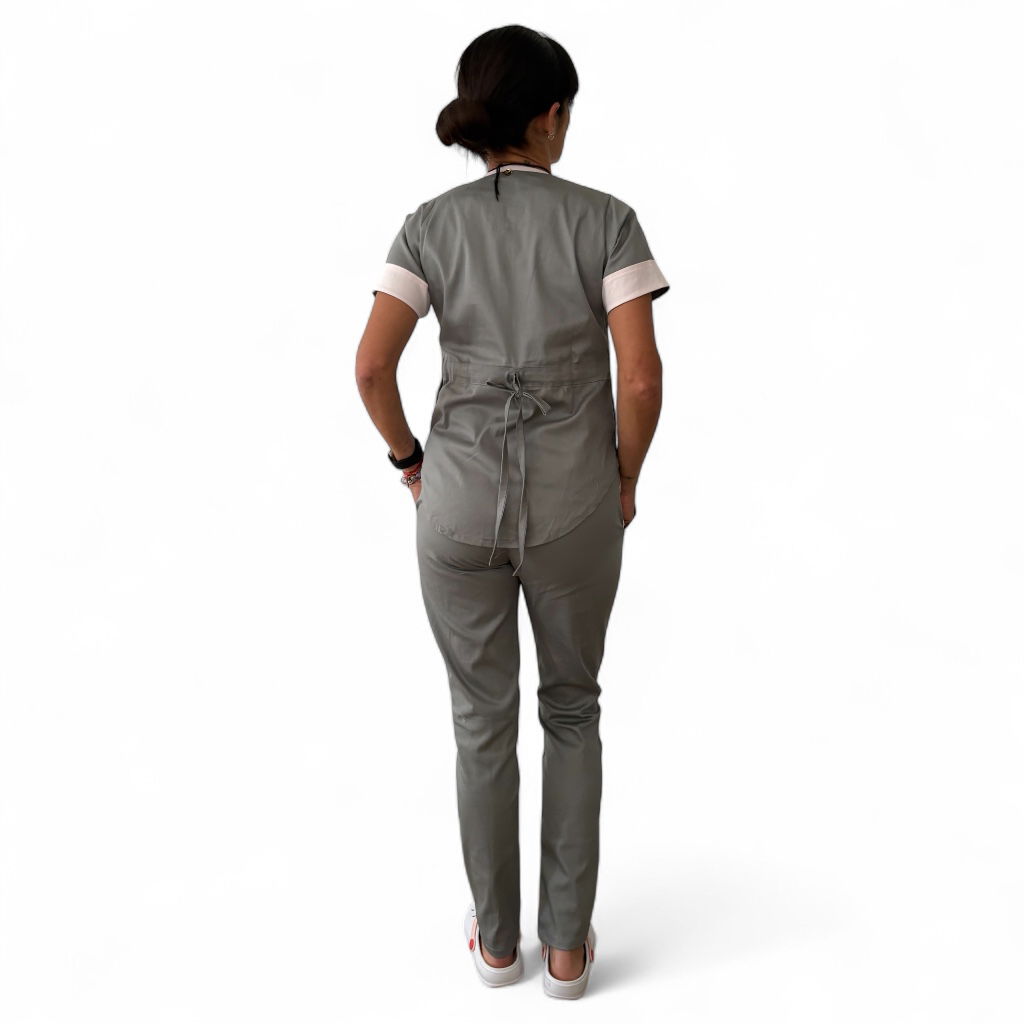 Tela Spandex ( 97% Algodón, 3% elastano). Chaqueta de Spandex, cuello redondo con tres/cuatro botones, con dos bolsillos laterales y uno superior delantero. Espalda con tiras ajustables. Pantalón de Spandex, Chupin, con elástico en cintura trasera y bolsillos laterales.