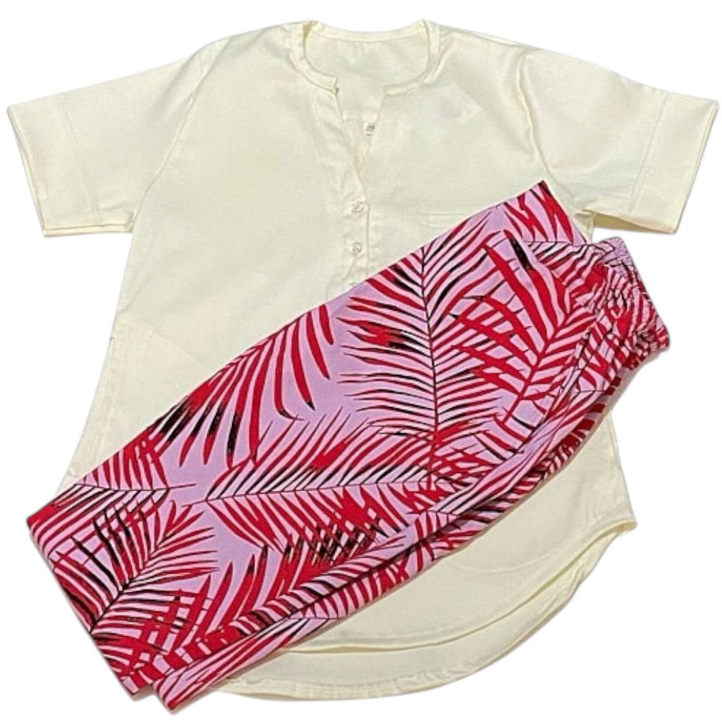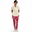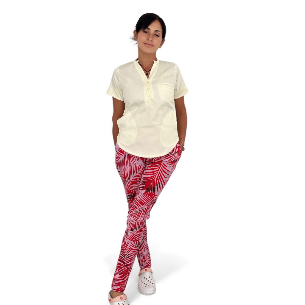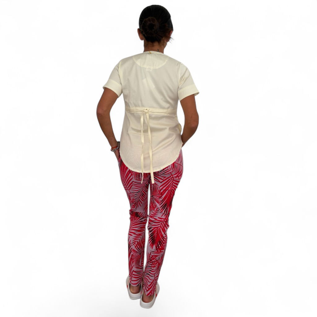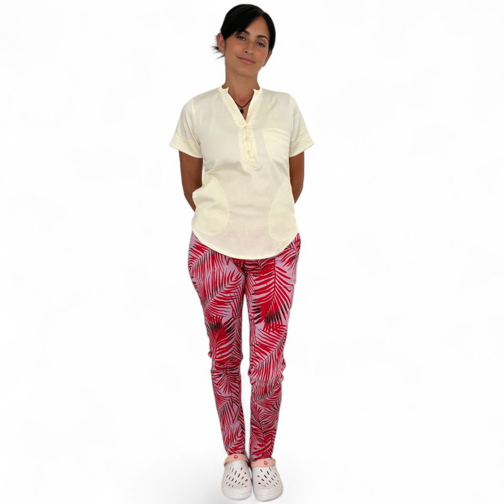 Tela bengalina (28 nylon 68 rayón y 4 spandex). Chaqueta de Spandex, cuello redondo con tres/cuatro botones, con dos bolsillos laterales y uno superior delantero. Espalda con tiras ajustables. Pantalón de Spandex, Chupin, con elástico en cintura trasera y bolsillos laterales.
