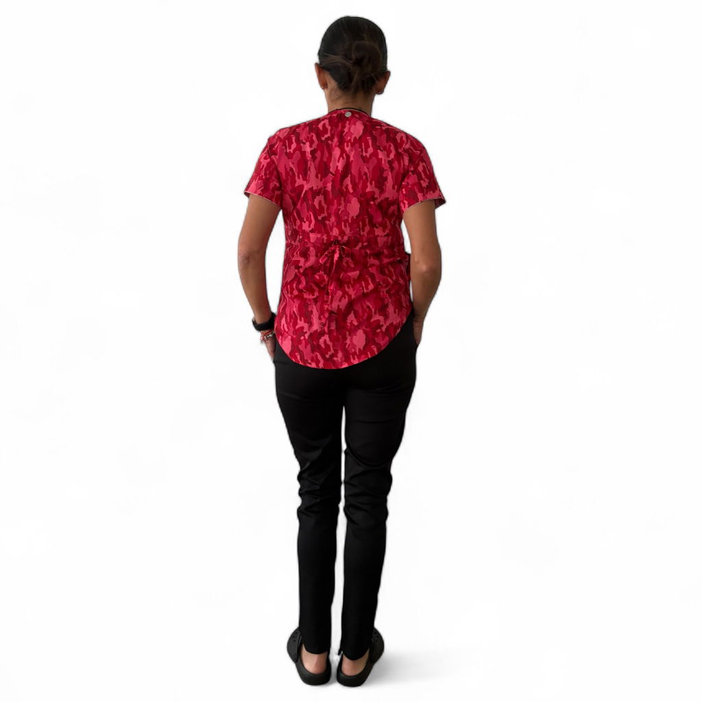 Tela Spandex ( 97% Algodón, 3% elastano). Chaqueta de Spandex, cuello redondo con tres/cuatro botones, con dos bolsillos laterales y uno superior delantero. Espalda con tiras ajustables. Pantalón de Spandex, Chupin, con elástico en cintura trasera y bolsillos laterales.