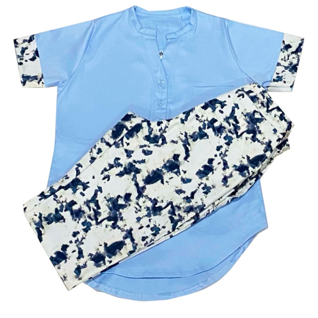 Tela Spandex ( 97% Algodón, 3% elastano). Chaqueta de Spandex, cuello redondo con tres/cuatro botones, con dos bolsillos laterales y uno superior delantero. Espalda con tiras ajustables. Pantalón de Spandex, Chupin, con elástico en cintura trasera y bolsillos laterales.