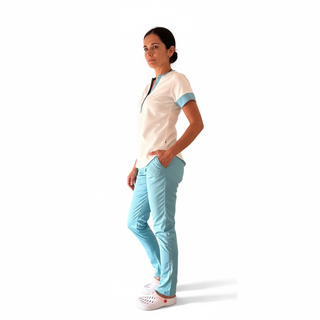 Tela Spandex ( 97% Algodón, 3% elastano). Chaqueta de Spandex, cuello redondo con tres/cuatro botones, con dos bolsillos laterales y uno superior delantero. Espalda con tiras ajustables. Pantalón de Spandex, Chupin, con elástico en cintura trasera y bolsillos laterales.