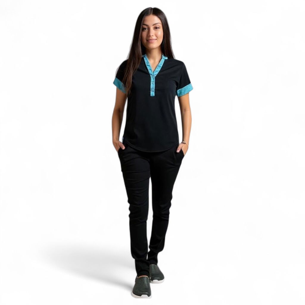 Tela Spandex ( 97% Algodón, 3% elastano). Chaqueta de Spandex, cuello redondo con tres/cuatro botones, con dos bolsillos laterales y uno superior delantero. Espalda con tiras ajustables. Pantalón de Spandex, Chupin, con elástico en cintura trasera y bolsillos laterales.