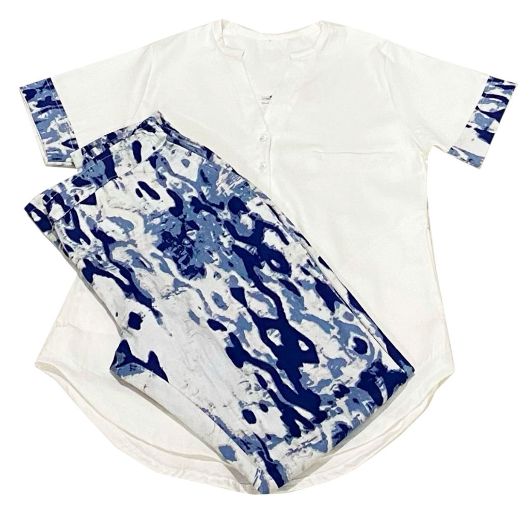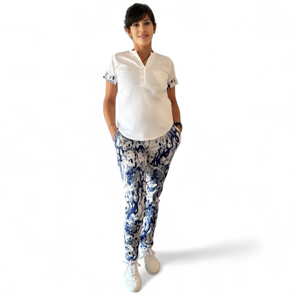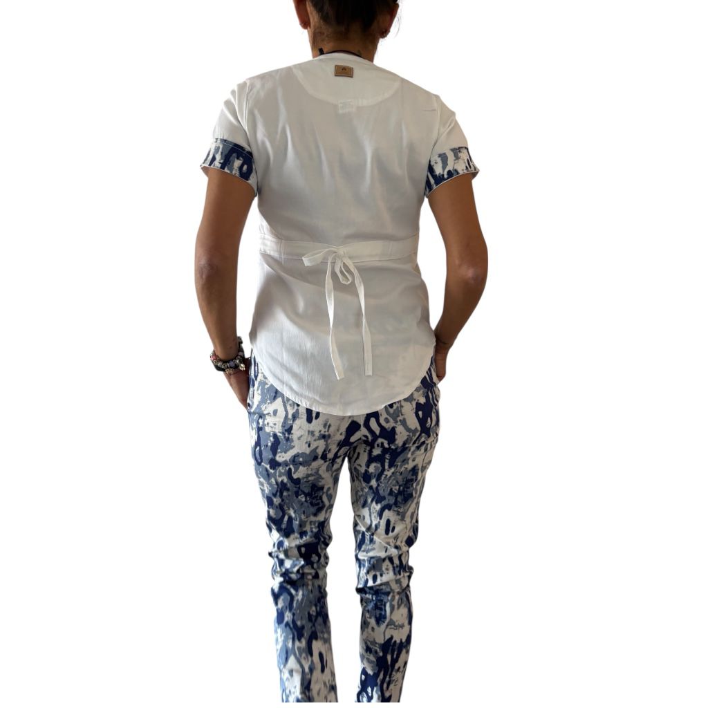 Tela Spandex ( 97% Algodón, 3% elastano). Chaqueta de Spandex, cuello redondo con tres/cuatro botones, con dos bolsillos laterales y uno superior delantero. Espalda con tiras ajustables. Pantalón de Spandex, Chupin, con elástico en cintura trasera y bolsillos laterales.