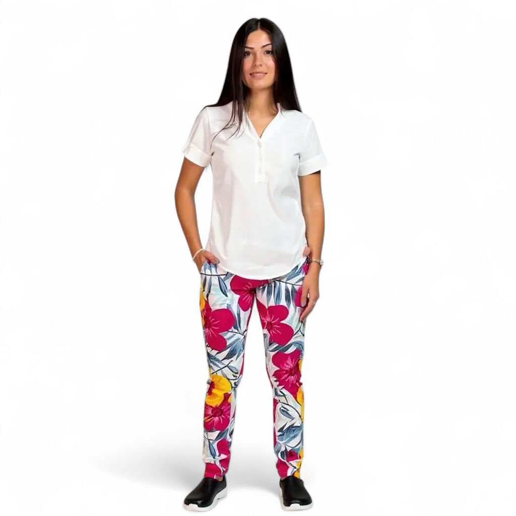 Tela bengalina (28 nylon 68 rayón y 4 spandex). Chaqueta de Spandex, cuello redondo con tres/cuatro botones, con dos bolsillos laterales y uno superior delantero. Espalda con tiras ajustables. Pantalón de Spandex, Chupin, con elástico en cintura trasera y bolsillos laterales.
