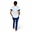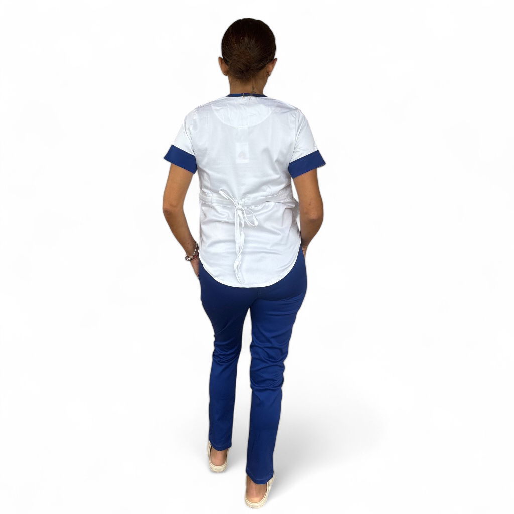 Tela Spandex ( 97% Algodón, 3% elastano). Chaqueta de Spandex, cuello redondo con tres/cuatro botones, con dos bolsillos laterales y uno superior delantero. Espalda con tiras ajustables. Pantalón de Spandex, Chupin, con elástico en cintura trasera y bolsillos laterales.