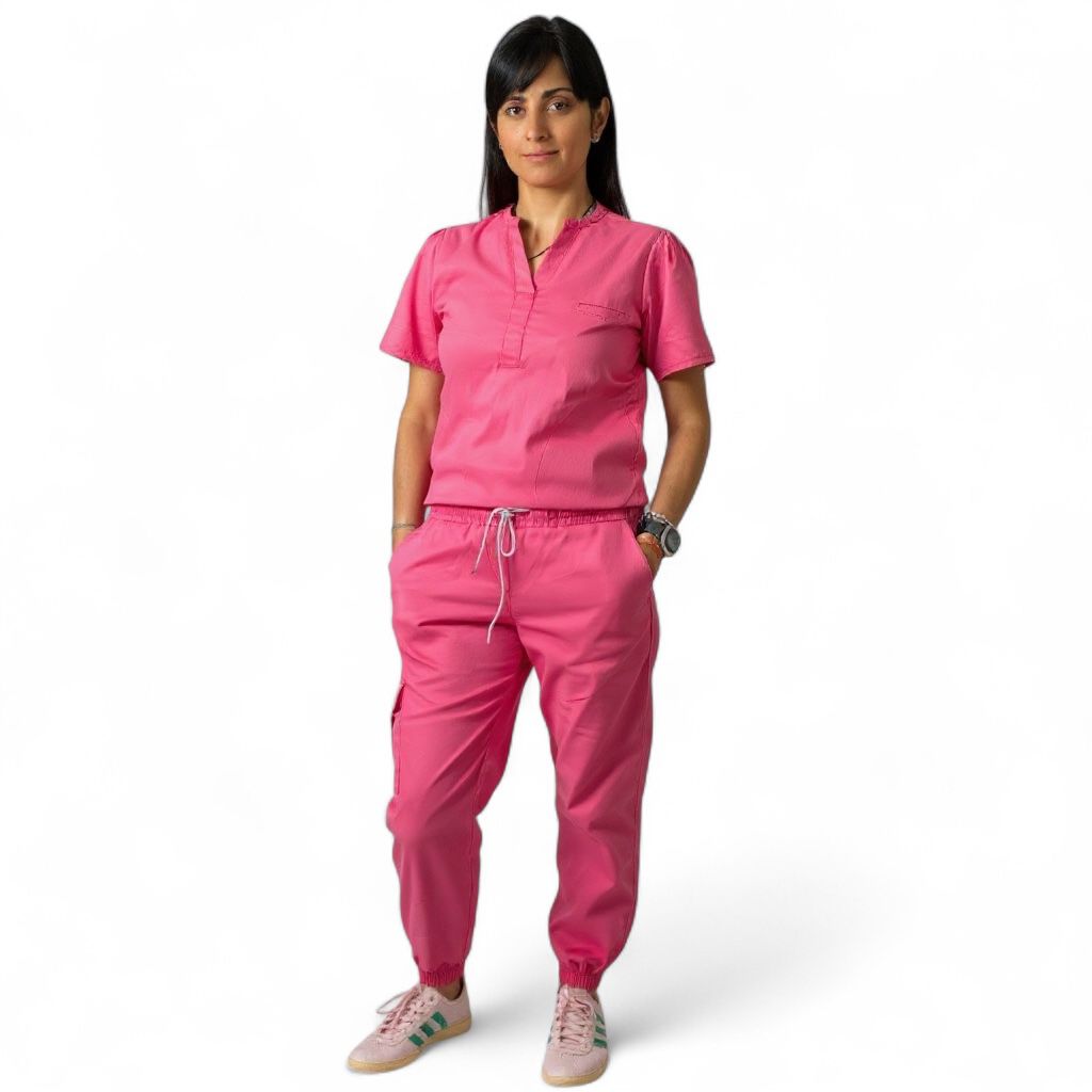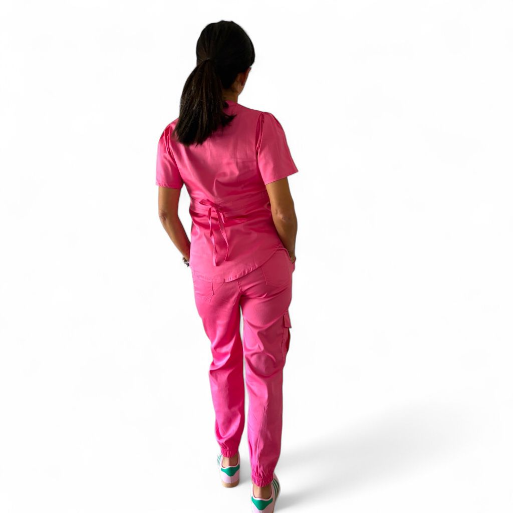 Chaqueta de Spandex, o, cuello en V , mangas princesa , con dos bolsillos laterales y uno superior delantero aplicado. Espalda con tiras ajustables.